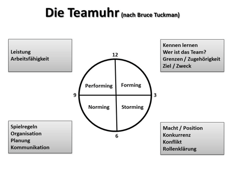 Die Gruppenbildung im kooperativen Lernen erfolgt immer nach einem einheitlichen Muster: Gruppenbildung, Gruppenfindung und Gruppenentwicklung. Es gibt eine Vielzahl an Methoden, mit denen Zufallsgruppen gebildet werden können. Die Schrittweise zur Teambildung hat ihren Ursprung im Phasenmodell von Bruce TUCKMAN, der sogenannten Teamuhr.